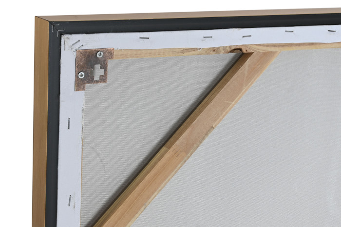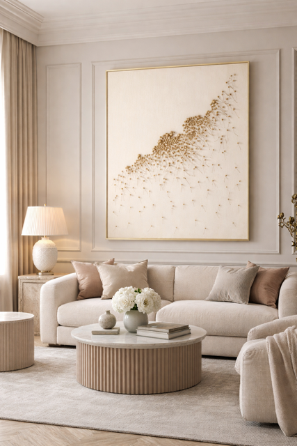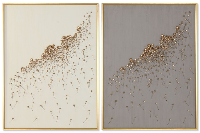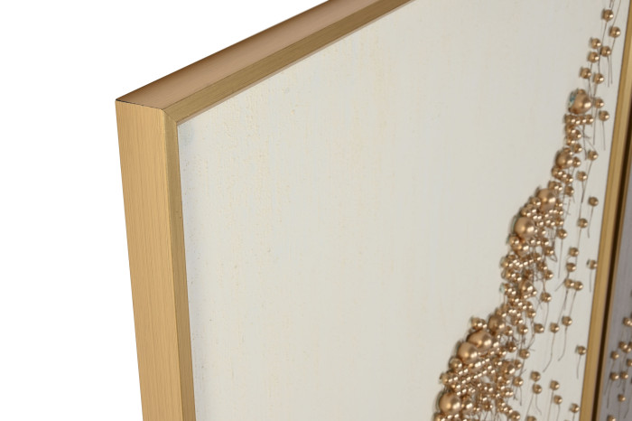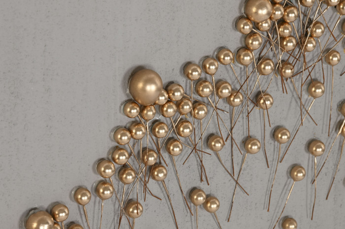 Złote elementy rozmieszczone na fakturowym tle tworzą wrażenie ruchu i przestrzenności, które zmienia się w zależności od kąta patrzenia i oświetlenia wnętrza. Trójwymiarowa forma nadaje obrazowi głębi, a stonowana kolorystyka tła pozwala złotym detalom subtelnie zaznaczyć swoją obecność. Całość przypomina nowoczesną kompozycję inspirowaną sztuką instalacyjną i współczesnym designem.