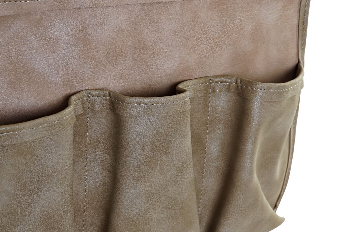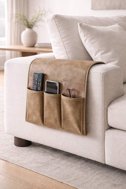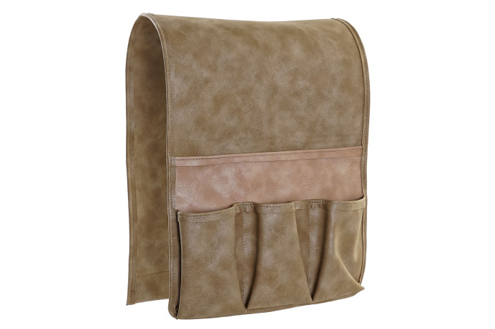Organizer swobodnie opiera się na boku sofy lub fotela, oferując kilka kieszeni na piloty, telefon, książkę czy drobne akcesoria. Stonowana kolorystyka i surowa faktura materiału podkreślają jego ponadczasowy wygląd, który dobrze komponuje się z tkaninami, skórą oraz drewnem.