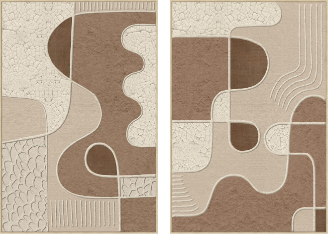 Trójwymiarowa powierzchnia obrazu łączy różne faktury i wykończenia, tworząc efekt reliefu widoczny zarówno z bliska, jak i z większej odległości. Stonowana paleta barw oparta na beżach, kremach i ciepłych odcieniach ziemi sprawia, że obraz pięknie reaguje na światło i naturalnie wpisuje się w nowoczesne aranżacje.