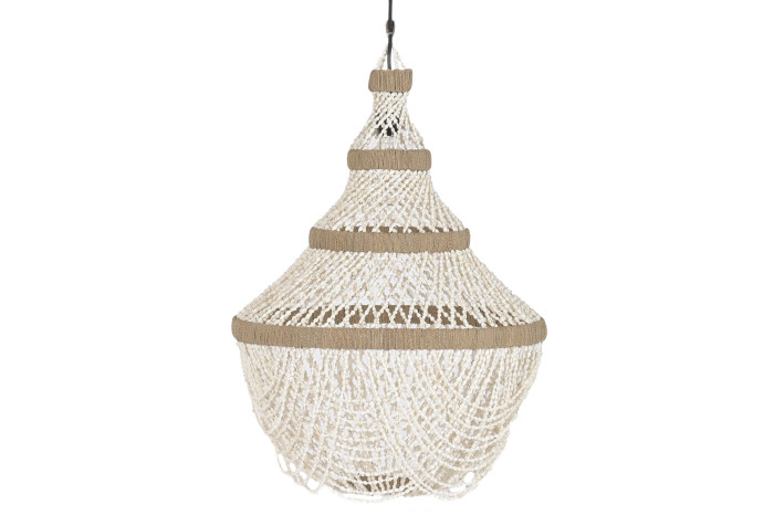 Ażurowa struktura klosza sprawia, że światło delikatnie przenika przez warstwy muszli, tworząc nastrojową atmosferę i subtelne refleksy na ścianach. Naturalna kolorystyka w odcieniach bieli i piasku doskonale współgra z drewnem, tkaninami oraz jasnymi, neutralnymi wnętrzami. Każda lampa posiada unikalny charakter, wynikający z ręcznego wykonania.