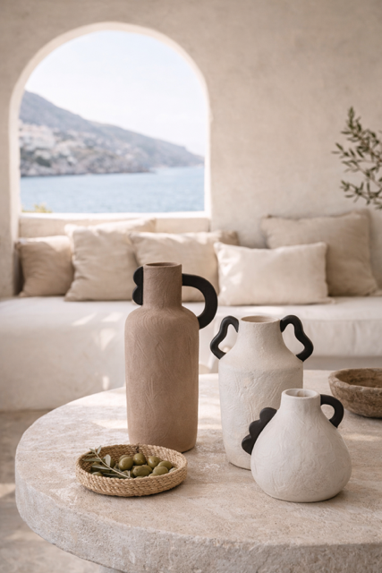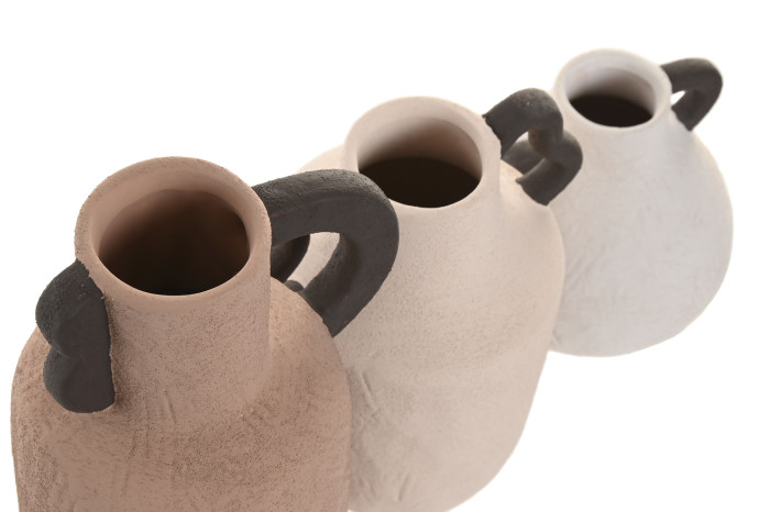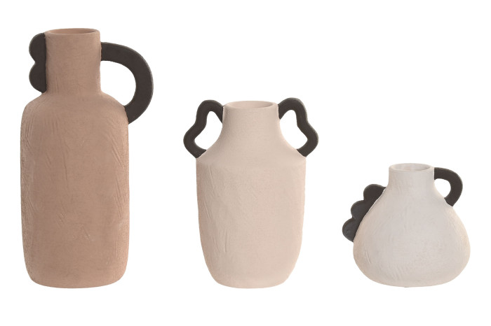 Wazony różnią się wysokością i formą, dzięki czemu doskonale prezentują się zarówno jako zestaw, jak i pojedyncze akcenty dekoracyjne. Subtelnie zaznaczone uchwyty oraz lekko nieregularna powierzchnia podkreślają rzemieślniczy charakter kolekcji. Stonowane odcienie ziemi pięknie komponują się z drewnem, kamieniem i tkaninami o naturalnych splotach.