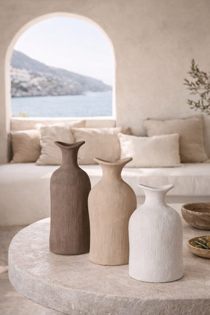 Wazony różnią się proporcjami i wysokością, co pozwala tworzyć dynamiczne, ale spokojne aranżacje. Odcienie gliny, piasku i jasnej ceramiki pięknie reagują na światło i doskonale współgrają z naturalnymi materiałami. Subtelna faktura powierzchni podkreśla ich rzeźbiarski charakter i autentyczność.