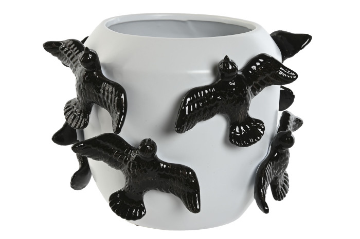 Wazon ceramiczny Black Birds to dekoracyjny obiekt, który łączy funkcję wazonu i donicy w jednej, wyrazistej formie. Niska, masywna bryła została opleciona czarnymi sylwetkami ptaków w locie, tworząc dynamiczną kompozycję kontrastującą z gładką, jasną ceramiką. To forma, która działa wizualnie niezależnie od tego, czy wypełniona jest rośliną, gałęzią czy pozostaje pusta jako obiekt rzeźbiarski.