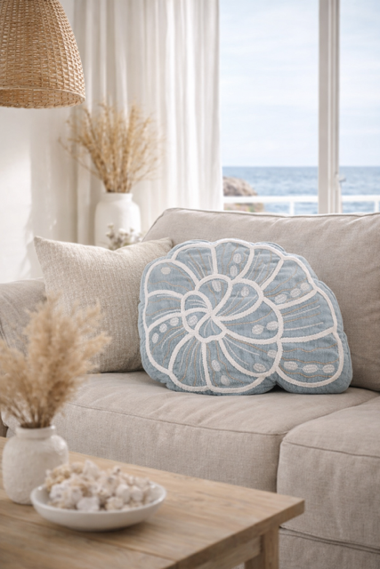 Poduszka Muszla morska doskonale odnajduje się w aranżacjach inspirowanych naturą, stylem coastal, modern classic czy soft modern. Świetnie uzupełnia jasne przestrzenie, beżowe sofy, tapicerowane fotele oraz wnętrza, w których liczy się spokój, światło i subtelne detale. To dekoracja, która nie dominuje — lecz dopełnia.