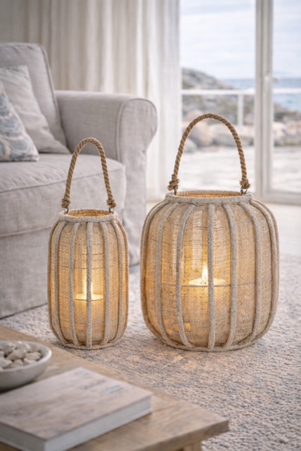 Latarenka Soft Wave 30 cm to bardziej zdecydowana odsłona naturalnego światła inspirowanego rytmem przyrody. Jej obła sylwetka i pionowy układ plecionych włókien przywodzą na myśl miękkie fale oraz spokojny ruch powietrza nad piaskiem. To dekoracja, która zaznacza swoją obecność w przestrzeni, nie tracąc przy tym lekkości i harmonii.