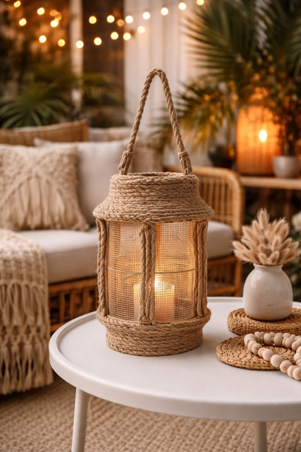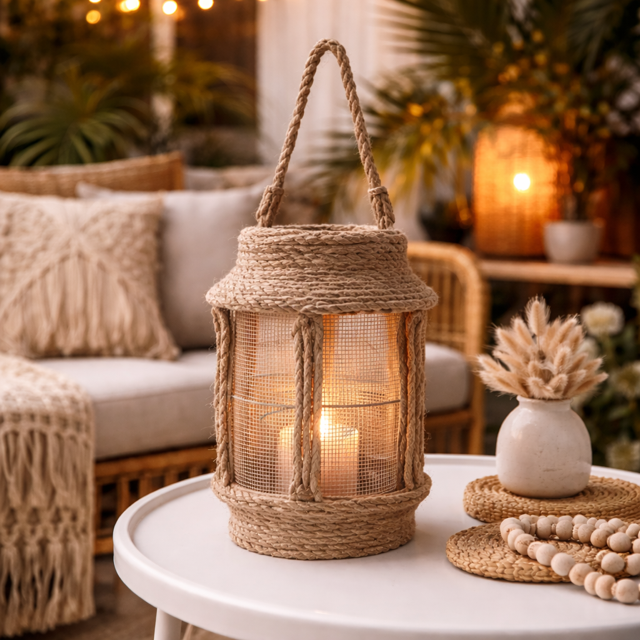 Ta latarenka nie próbuje błyszczeć – ona uspokaja. Naturalna juta, delikatna siatka i miękka, pionowa forma przywodzą na myśl letni wieczór, kiedy światło świecy nie oświetla przestrzeni wprost, ale sączy się spokojnie pomiędzy włóknami. Latarenka jutowa Boho tworzy atmosferę bliskości z naturą, w której liczy się rytm, faktura i ciepło światła.