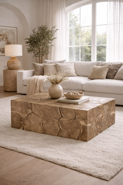 Ława świetnie odnajduje się zarówno we wnętrzach rustykalnych, jak i nowoczesnych. W towarzystwie jasnych, lnianych tkanin, miękkich dywanów i roślin stanie się sercem salonu rodzinnego. W minimalistycznych przestrzeniach doda ciepła i organicznego kontrastu. Doskonale współgra z beżami, miedzią, glinianymi dekoracjami czy czernią dodatków.