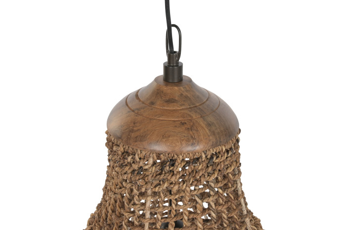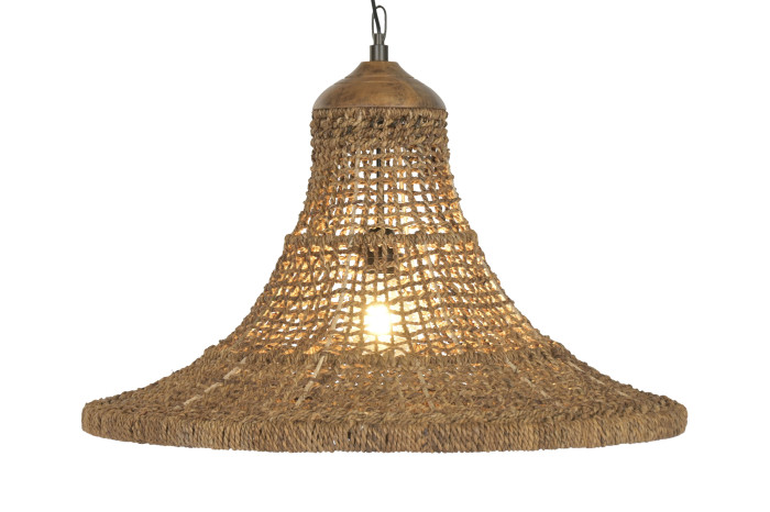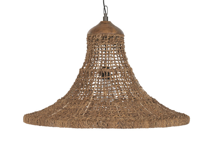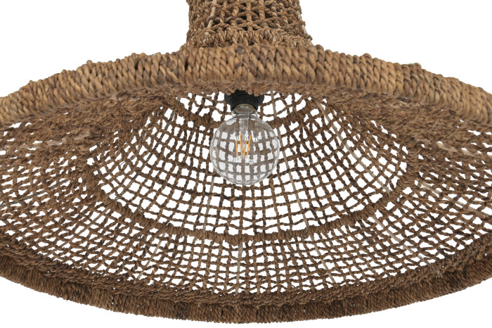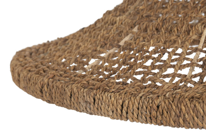 Ręcznie pleciona struktura tworzy miękką grę światła i cienia, która zmienia się w zależności od pory dnia. W ciągu dnia lampa działa jak rzeźbiarski obiekt, a wieczorem zamienia się w źródło przytulnej, rozproszonej poświaty. Każdy splot opowiada o pracy rąk, o cierpliwości i uważności — o pięknie, które rodzi się z natury, a nie z pośpiechu.