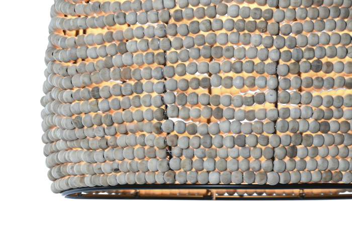 Drewniane perły subtelnie filtrują światło, pozwalając mu przenikać przez strukturę lampy i tworzyć delikatną, rozproszoną poświatę. Alaya nie operuje ostrym światłem — działa nastrojowo, spokojnie i harmonijnie. Nawet po zgaszeniu pełni rolę dekoracyjnego akcentu, przypominając zawieszoną w przestrzeni instalację artystyczną.
