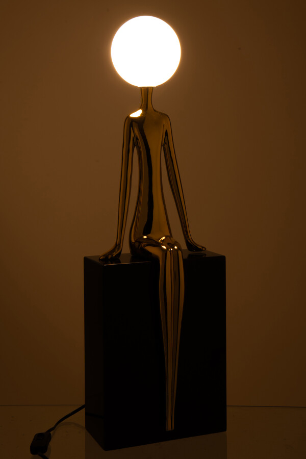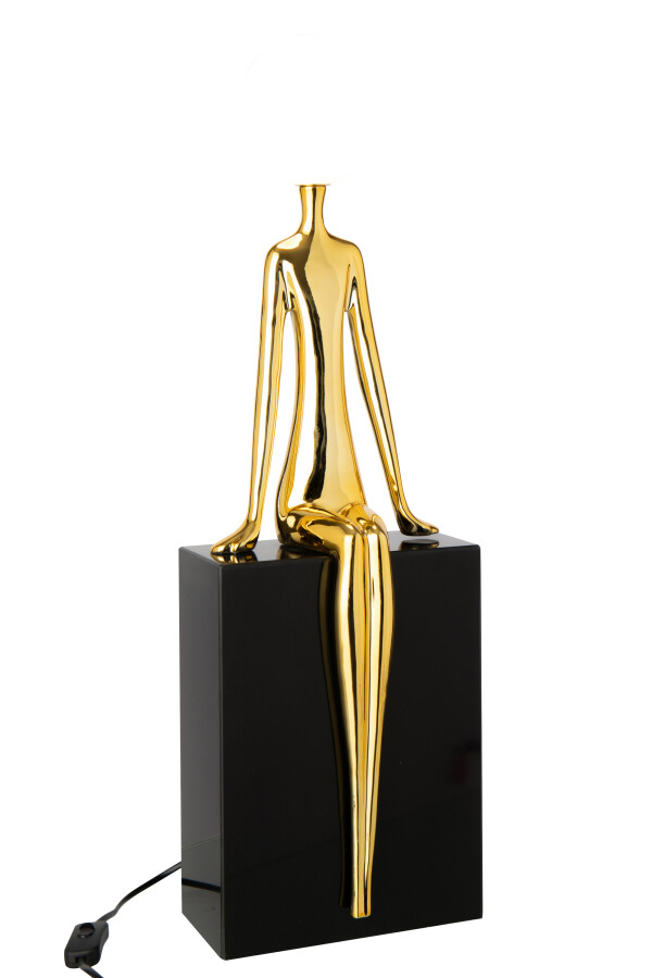 Lampa stołowa Muse Gold to wyrafinowane połączenie sztuki użytkowej i rzeźby dekoracyjnej. Smukła, siedząca sylwetka w lustrzanym, złotym wykończeniu tworzy elegancki kontrapunkt dla mlecznobiałego, kulistego klosza, który emituje miękkie, nastrojowe światło. Całość osadzona została na minimalistycznej, czarnej podstawie, podkreślającej luksusowy charakter projektu.