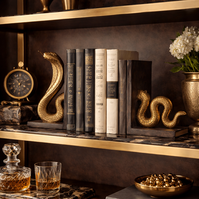 Podpórki do książek Snake to dekoracyjny duet, który łączy funkcję użytkową z wyrazistą formą rzeźbiarską. Motyw węża, poprowadzony w dynamicznej linii i zestawiony z geometryczną, prostą bryłą podstawy, tworzy kompozycję inspirowaną estetyką cabinet of wonders. To obiekt, który porządkuje przestrzeń półki lub regału, jednocześnie nadając jej kolekcjonerski charakter.