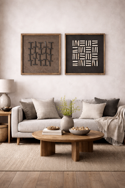 Abstrakcyjne wzory, które składają się na ten zestaw, są nie tylko artystycznym akcentem, ale również doskonałym rozwiązaniem do wnętrz urządzonych w duchu minimalizmu. Obrazy świetnie komponują się w salonach, jadalniach czy nowoczesnych przestrzeniach biurowych, wprowadzając subtelny, ale wyrazisty element dekoracyjny. Drewniana rama podkreśla ich naturalny charakter, a materiały użyte do ich produkcji dodają każdemu dziełu niepowtarzalnego uroku.