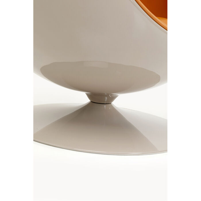 Zamknięta, organiczna bryła nadaje fotelowi niemal rzeźbiarski charakter, przyciągając uwagę czystością linii i perfekcyjnymi proporcjami. Jasna, gładka powierzchnia zewnętrzna kontrastuje z intensywnym, pomarańczowym wnętrzem, tworząc efekt wyrafinowanej głębi. Miękka tapicerka buduje komfortową, osłoniętą przestrzeń do relaksu, a obrotowa podstawa wprowadza nowoczesną dynamikę użytkowania.
