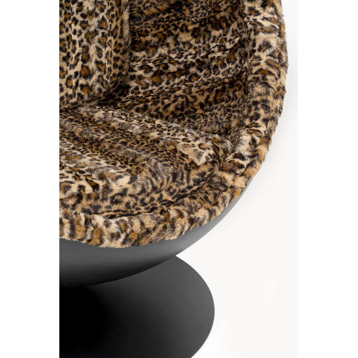 Charakterystyczna, zamknięta bryła fotela zachowuje swój ikoniczny, rzeźbiarski charakter, jednocześnie zyskując nowy wymiar dzięki tapicerce w motywie leopard. Miękka, wyrazista faktura wnętrza kontrastuje z gładką, ciemną powierzchnią zewnętrzną, tworząc efekt luksusowej głębi i teatralnej elegancji. Obrotowa podstawa dodaje całości nowoczesnej lekkości, równoważąc odważny charakter wykończenia.