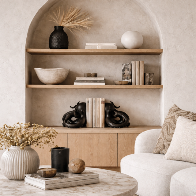 Podpórki do książek Octopus to nie dodatek, lecz pełnoprawny obiekt designu, który funkcjonuje na styku sztuki użytkowej i rzeźby. Forma ośmiornicy, dynamiczna i pełna napięcia, sprawia wrażenie zatrzymanego ruchu – jakby morska istota właśnie wynurzyła się z głębi. To przedmiot, który redefiniuje pojęcie podpórki do książek, zmieniając ją w wyrazisty element narracji wnętrza.
