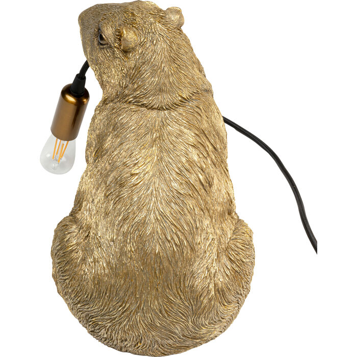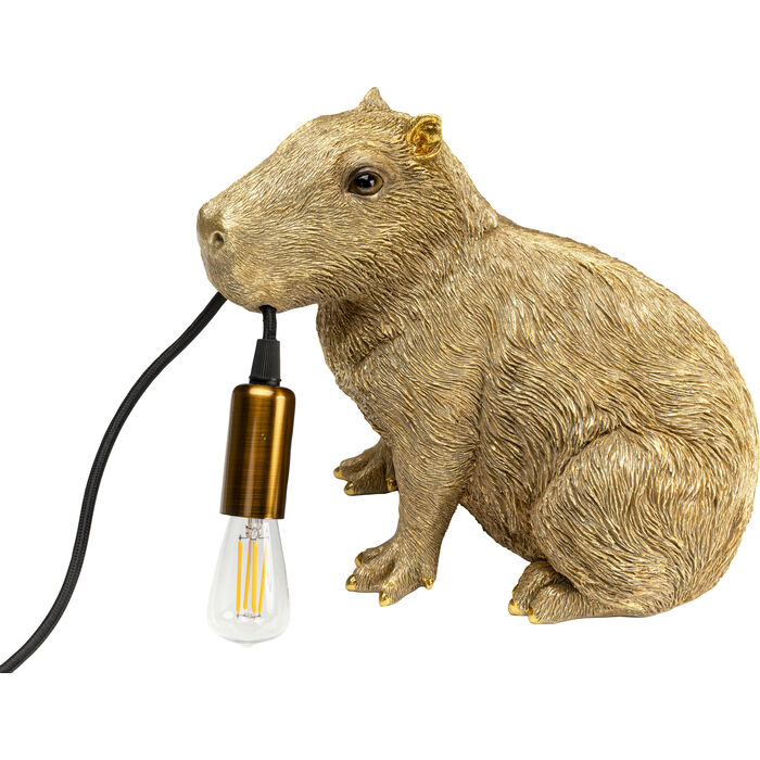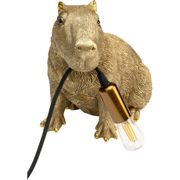 Forma sympatycznej kapibary została potraktowana jak mała rzeźba — dopracowana, wyrazista i pełna charakteru. Złota powierzchnia pięknie odbija światło, a odsłonięta żarówka dodaje całości dekoracyjnego, lekko teatralnego efektu. To połączenie sztuki użytkowej z designem, który nie boi się dystansu do siebie.