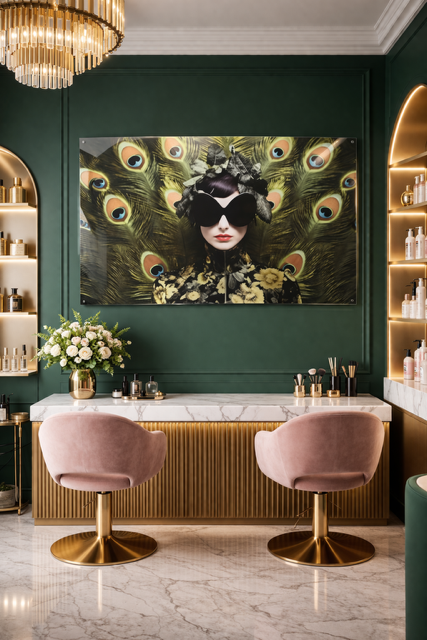 To ogromny, efektowny format 150x100 cm, który buduje wnętrze jak scenografia do sesji haute couture. Szklana tafla nadaje całości głębi i połysku, podkreślając nasycenie barw – głęboką zieleń, złoto i czerń. To obraz, który staje się centralnym punktem salonu, lobby, sypialni czy eleganckiego apartamentu.