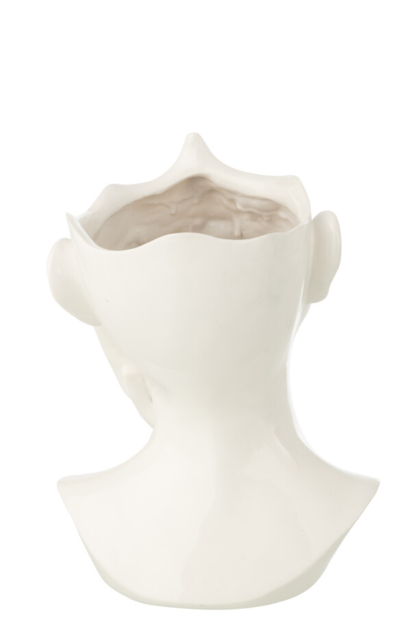 Biel podkreśla każdy detal twarzy i dłoni, wydobywając miękkość linii oraz rzeźbiarski charakter obiektu. Gładka, lśniąca powierzchnia sprawia, że donica reaguje na światło i otoczenie, zmieniając swój wyraz w zależności od aranżacji. To design, który pozostaje aktualny niezależnie od trendów.
