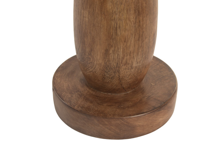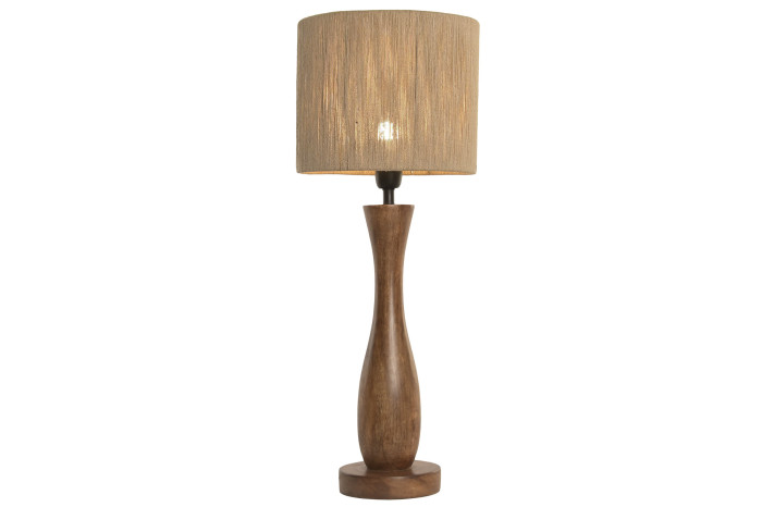 Lampa stołowa drewniana Elara to subtelna interpretacja tej samej, rzeźbiarskiej linii, która definiuje kolekcję. Smukła, miękko wyprofilowana podstawa z drewna tworzy elegancką, organiczną sylwetkę, idealnie wyważoną w proporcji do cylindrycznego abażuru. To oświetlenie, które buduje atmosferę poprzez detal.