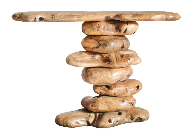 Nie stoi przy ścianie. Ona ją redefiniuje. Monolith Tree to pionowa rzeźba z drewna tekowego, która wygląda jak fragment pradawnego pejzażu przeniesiony do architektonicznej przestrzeni. Warstwowo układane, organiczne bryły tworzą rytm – niemal ceremonialny. Blat jest spokojny, niemal ascetyczny. Podstawa pulsuje energią natury. To napięcie między surowością a elegancją sprawia, że nie sposób przejść obok niej obojętnie.