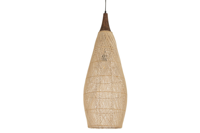 Precyzyjny, ręcznie inspirowany splot tworzy lekką, półtransparentną strukturę, przez którą światło filtruje się miękko i warstwowo. Wydłużona forma sprawia, że iluminacja rozkłada się subtelnie w dół, podkreślając faktury stołu, kamienia czy naturalnych tkanin. Drewniany detal przy podsufitce dopełnia kompozycję i nadaje jej szlachetnego, rzemieślniczego charakteru.
