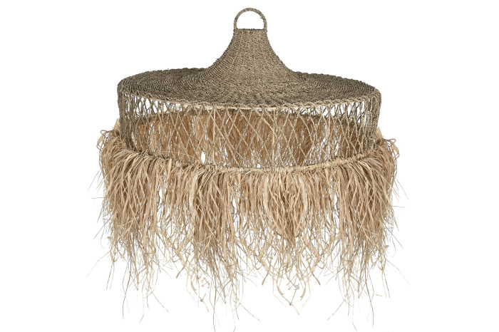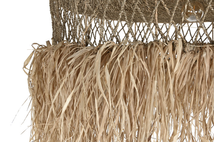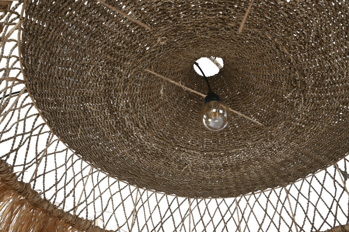 Klosz wykonany z naturalnych włókien zachwyca strukturą – ażurowy splot w górnej części subtelnie filtruje światło, a swobodnie opadające frędzle wprowadzają ruch i organiczną miękkość. Wieczorem światło przenika przez plecioną strukturę, tworząc ciepłą, nastrojową aurę. Materiałowa autentyczność i rękodzielniczy charakter nadają wnętrzu wyrafinowanej, nieoczywistej głębi.