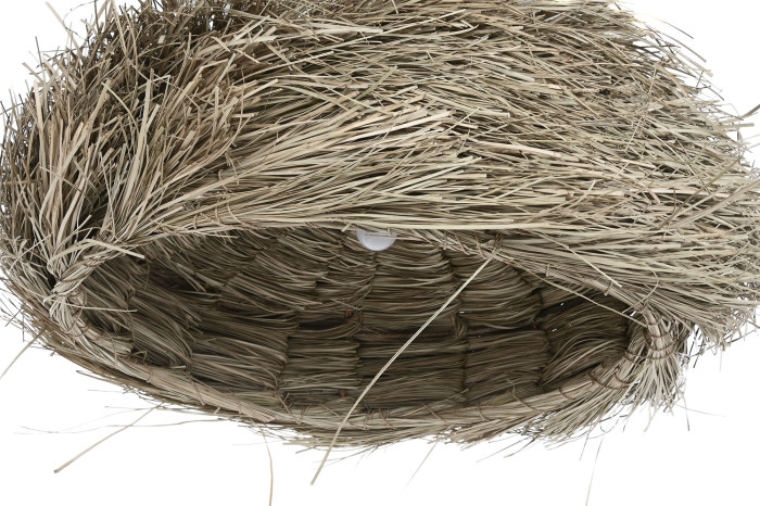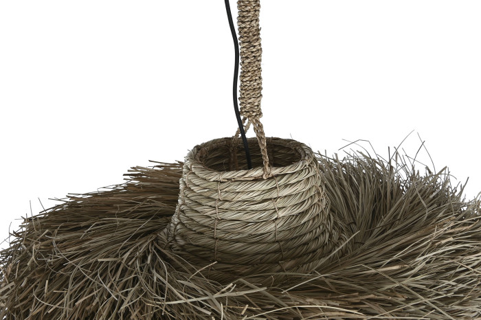 Gęsto ułożone włókna tworzą wielowarstwową strukturę, przez którą światło przenika miękko i nastrojowo. Iluminacja nie jest ostra – raczej otula przestrzeń, podkreślając faktury drewna, kamienia i lnu. Centralna, pleciona część klosza wprowadza stabilność kompozycji, kontrastując z dynamiczną, „dziką” krawędzią.