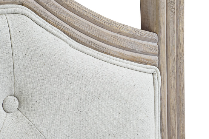 Tapicerowany panel z eleganckim pikowaniem capitonné tworzy rytmiczny układ światła i cienia. Jasna tkanina o lnianym charakterze nadaje powierzchni miękkość i naturalność, a drewniana rama w ciepłym odcieniu podkreśla szlachetny charakter projektu. To połączenie klasyki i naturalnych materiałów, które sprawia, że wnętrze staje się przytulne i dopracowane.