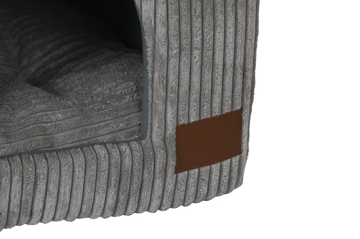 Charakterystyczny kształt domku sprawia, że legowisko przypomina budę z daszkiem, ale w znacznie bardziej komfortowej, domowej wersji. W środku znajduje się miękka poduszka, która działa jak wygodna leżanka dla psa lub kota. Dzięki temu pupil może się wygodnie położyć, zwinąć w kłębek lub oprzeć głowę przy wejściu i obserwować otoczenie.