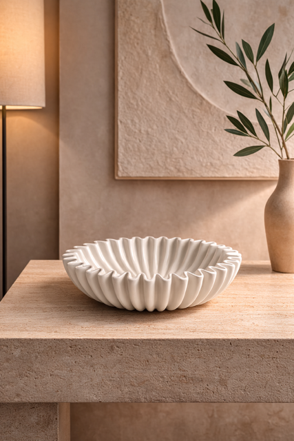 Są przedmioty, które nie potrzebują dodatkowych ozdób – ich forma sama w sobie staje się dekoracją. Misa Sculptura przypomina małą rzeźbę stworzoną z rytmicznych fal. Miękkie, harmonijne linie układają się w elegancki, dynamiczny kształt, który przyciąga spojrzenie niczym obiekt w galerii designu. Jej forma oparta jest na motywie subtelnych żłobień – tzw. flutingu – znanym z architektury i sztuki dekoracyjnej, gdzie powtarzające się rowki tworzą wyjątkową grę światła i cienia.