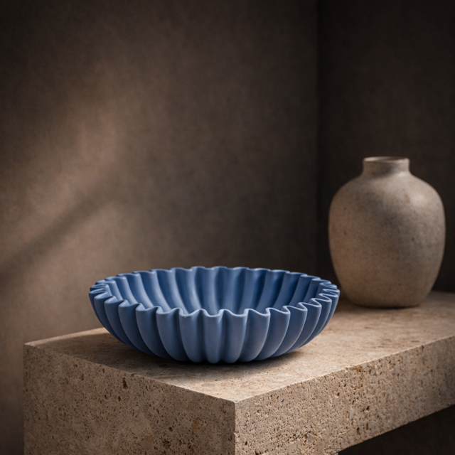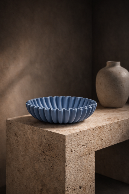 Delikatna, matowa powierzchnia misy podkreśla jej rzeźbiarski charakter. Falujące krawędzie tworzą elegancki rytm, dzięki któremu nawet prosty przedmiot codziennego użytku nabiera artystycznej ekspresji. W wersji białej misa emanuje spokojną, ponadczasową elegancją, natomiast niebieska odsłona wprowadza do wnętrza świeżość i subtelną kolorystyczną energię. To dekoracja, która wygląda pięknie zarówno jako samodzielny obiekt, jak i wypełniona owocami, dekoracyjnymi kulami czy sezonowymi kompozycjami.