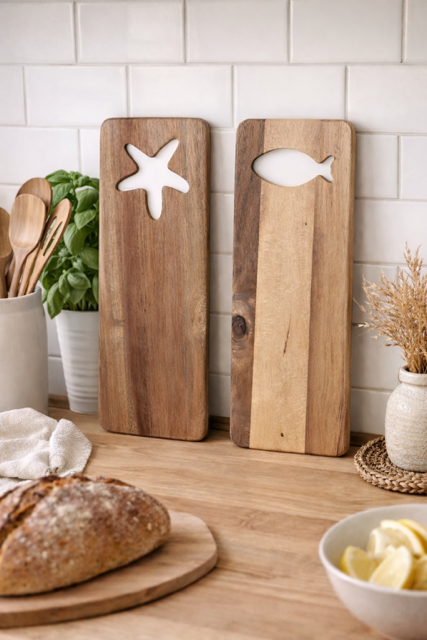 Są dodatki, które sprawiają, że zwykła codzienność nabiera wyjątkowego klimatu. Zestaw drewnianych desek do krojenia Coastal przywołuje atmosferę nadmorskiego domu, w którym poranki zaczynają się od zapachu świeżego chleba i kawy, a światło słońca wpada przez otwarte okna. Naturalne drewno oraz subtelne motywy rozgwiazdy i ryby tworzą dekoracyjny akcent, który wprowadza do kuchni lekkość i wakacyjny charakter.