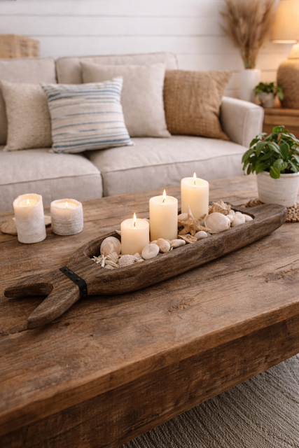 Ten wyjątkowy element doskonale odnajdzie się w aranżacjach inspirowanych naturą i autentycznością materiałów. Pięknie wygląda na drewnianym stole, konsoli w salonie lub na dużej wyspie kuchennej. W zestawieniu z lnem, ceramiką, świecami czy naturalnymi dekoracjami tworzy kompozycję pełną spokoju i surowej elegancji. Wnętrza rustic, industrial, modern organic oraz coastal zyskują dzięki niej charakter przypominający wakacyjny dom nad morzem.