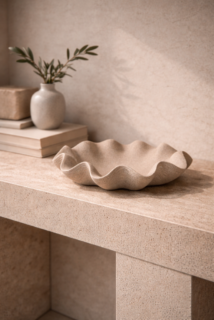Falująca linia tej misy przywodzi na myśl delikatny ruch wody i organiczne kształty spotykane w naturze. Jej nieregularna, miękka krawędź tworzy dynamiczną formę, która wygląda jak subtelna rzeźba ustawiona w przestrzeni. Światło delikatnie podkreśla załamania powierzchni, dzięki czemu misa zyskuje wyjątkową głębię i elegancki charakter.