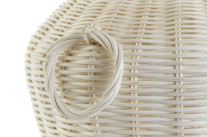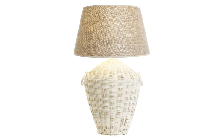 Podstawa lampy przypomina ręcznie plecioną rattanową formę, której lekka struktura wprowadza do wnętrza naturalną teksturę i ciepło. Jasna kolorystyka idealnie współgra z lnianym abażurem, dzięki czemu światło staje się miękkie i przyjemne. Całość tworzy dekorację, która wygląda jak element wystroju eleganckiego domu nad morzem – spokojnego, jasnego i pełnego naturalnej elegancji.