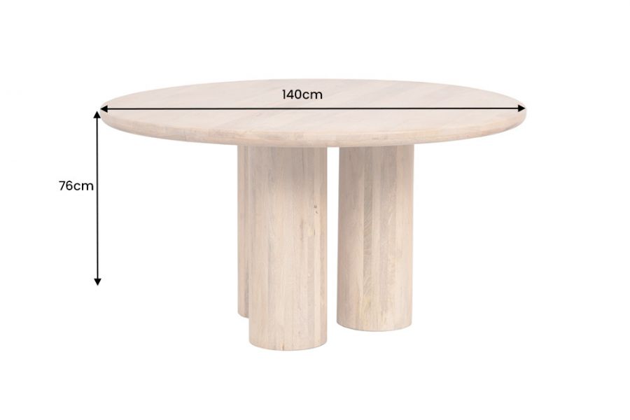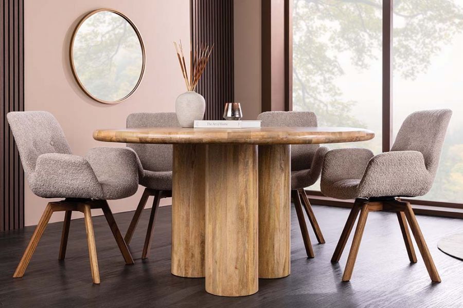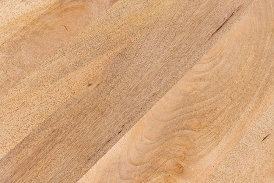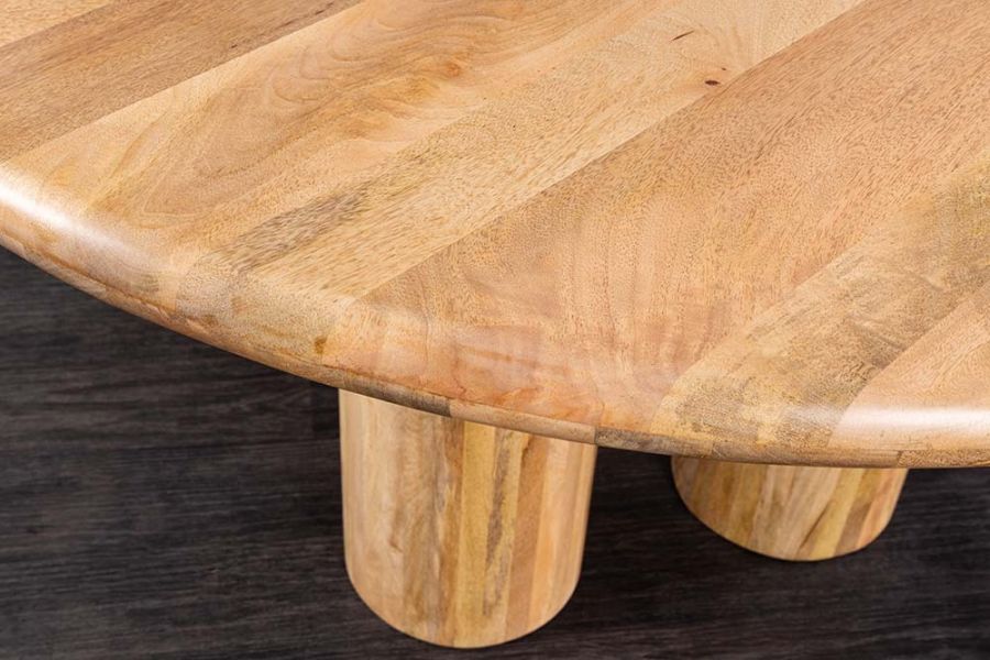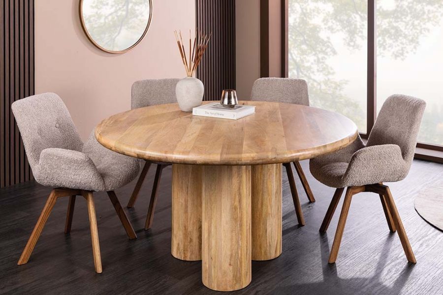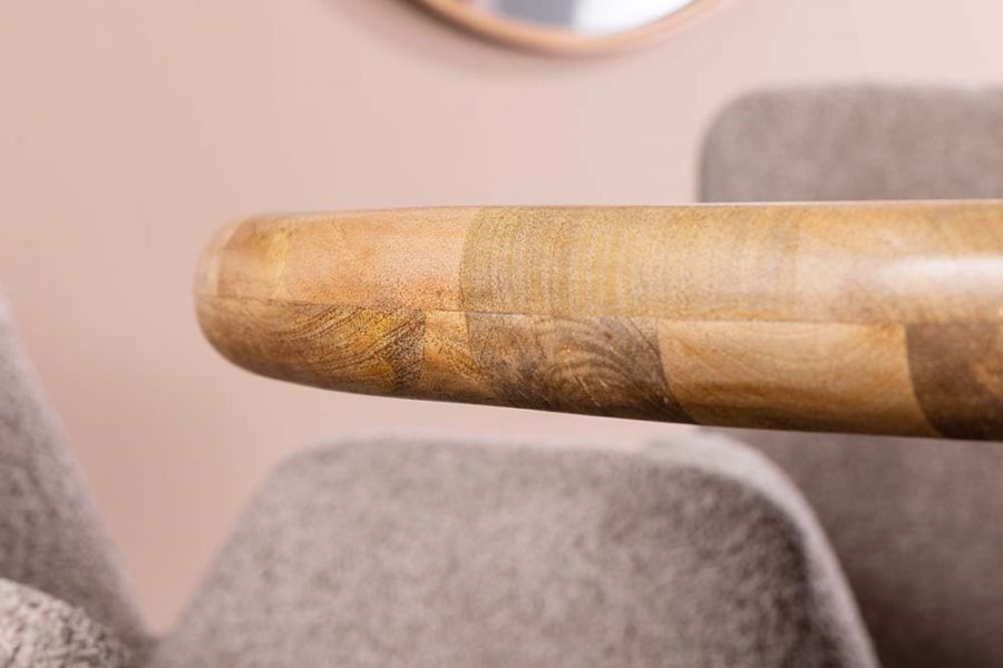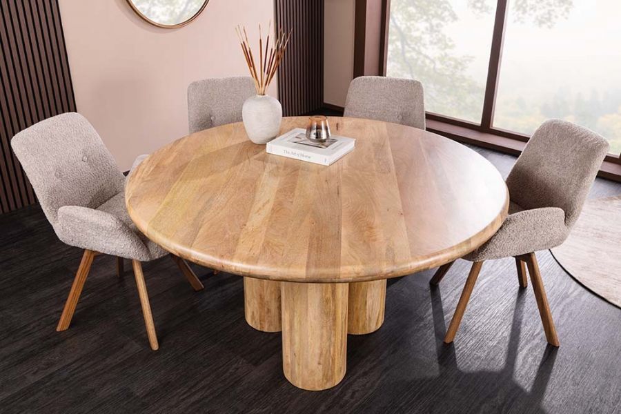 Stół Art Deco 140 cm to mebel, który natychmiast przyciąga uwagę — jego okrągły blat z drewna mango emanuje naturalnym ciepłem i subtelną elegancją. Charakterystyczna struktura drewna, z delikatnymi nieregularnościami i złocistą tonacją, nadaje projektowi organiczny rytm i niepowtarzalny charakter. Każde ujęcie drewna jest inne, dlatego ten stół nie tylko wypełnia przestrzeń funkcją, ale opowiada historię naturalnego piękna i autentyczności materiału.