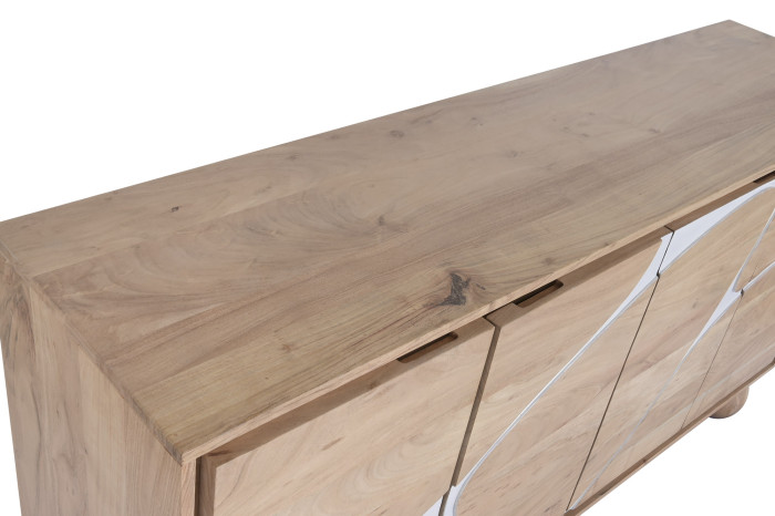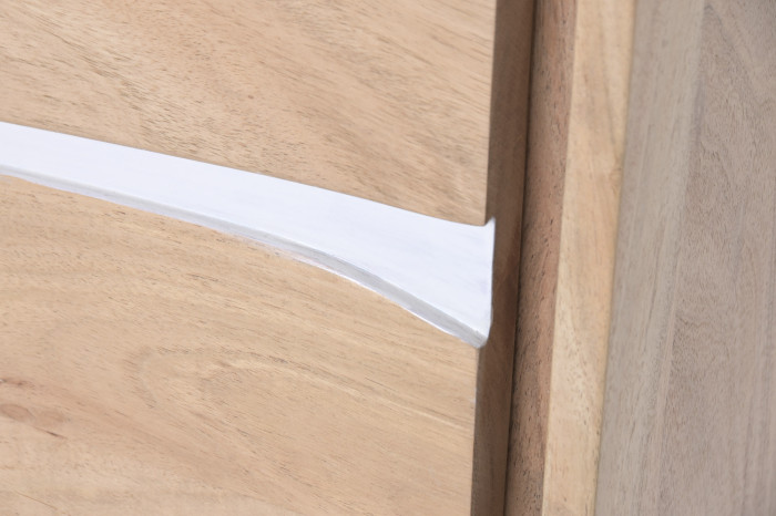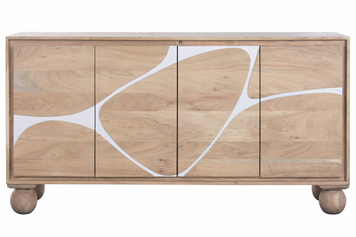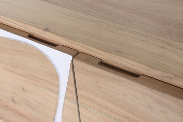 Mistrzowskie rzemiosło, które łączy klasyczne drewno akacjowe z nowoczesnym wzornictwem, sprawia, że komoda ta staje się nie tylko meblem, ale prawdziwą artystyczną deklaracją. Wzory na jej drzwiach, wycięte w białym kolorze, przypominają delikatne pociągnięcia pędzla, niemal jak abstrakcyjne dzieło sztuki, które wprowadza do wnętrza nutę wyrafinowania.