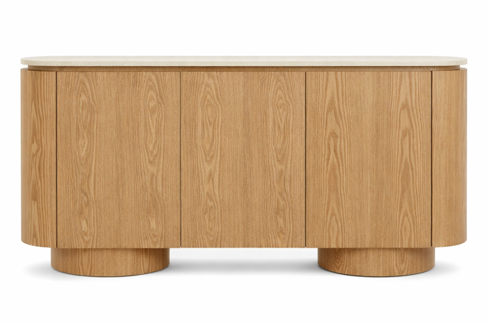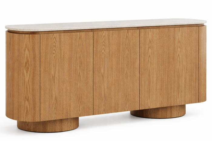Ciepły rysunek drewna tworzy subtelną, organiczną strukturę, która kontrastuje z kamienną, granitową płytą blatu. To zestawienie wprowadza do wnętrza balans – między miękkością natury a chłodną, szlachetną powierzchnią. Zaokrąglone podstawy nadają bryle lekkości, mimo jej solidnej, stabilnej formy.