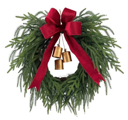 Zieleń wianka zachowuje lekkość i naturalny charakter, dzięki czemu całość wygląda świeżo i autentycznie. Głęboka, tekstylna kokarda nadaje kompozycji elegancji, a złote dzwonki wprowadzają delikatny akcent blasku – nieprzesadzony, ale wyczuwalny. To właśnie ten balans między naturalnością a subtelnym połyskiem sprawia, że dekoracja prezentuje się niezwykle stylowo.