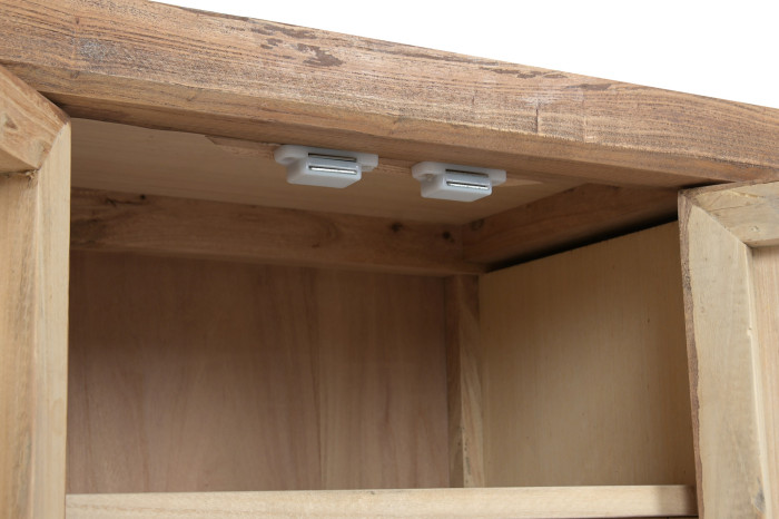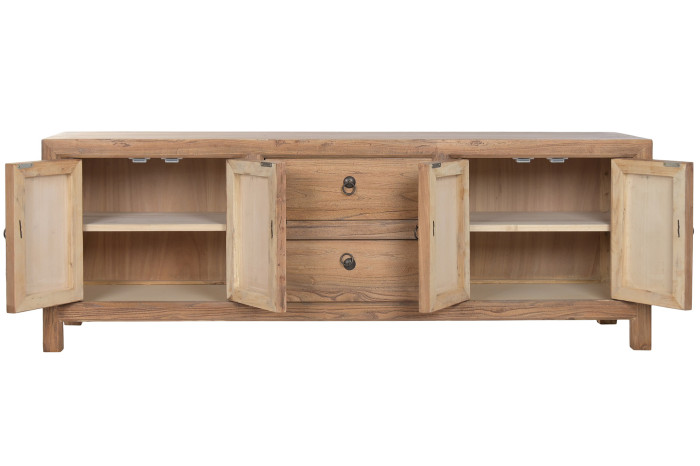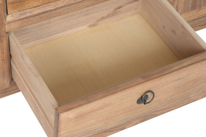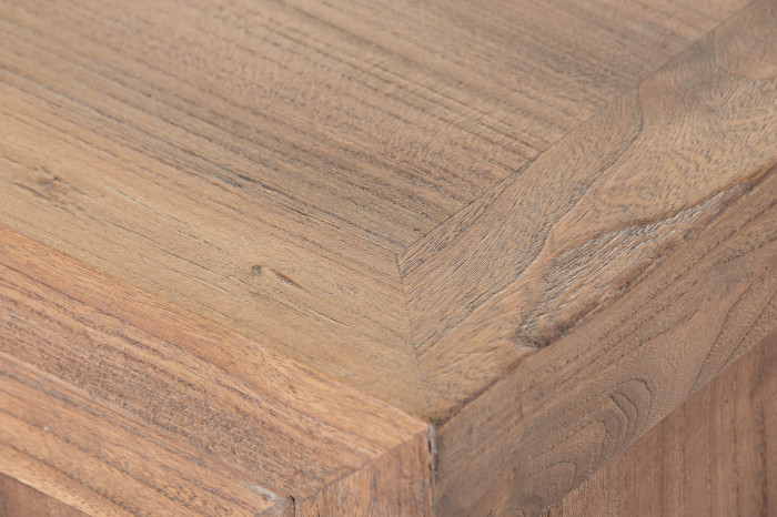 Wykonana z drewna pochodzącego z recyklingu, komoda niesie w sobie historię wcześniejszych miejsc i struktur. Każda powierzchnia ma swój własny rysunek, drobne niuanse i naturalne różnice, które sprawiają, że nie istnieją dwa identyczne egzemplarze. Takie drewno zachowuje swój unikalny charakter i trwałość, ponieważ jest już „przeżyte”, wysuszone i stabilne