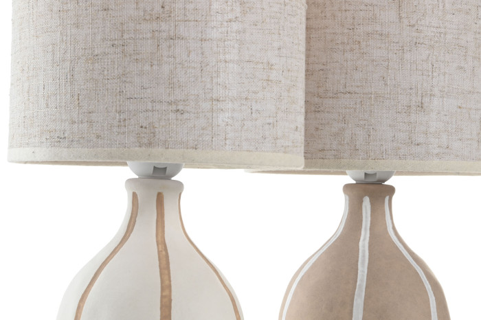 Ceramiczna podstawa z wyraźnie zaznaczonymi pasami przywodzi na myśl naturalne, organiczne rytmy – jak ślady pędzla na płótnie. Każda linia nadaje lampie indywidualny charakter, sprawiając, że nie jest to powtarzalny obiekt, lecz dekoracyjna forma z wyczuwalną ręką twórcy. Abażur z tkaniny rozprasza światło, wprowadzając do wnętrza miękką, ciepłą aurę.