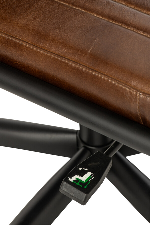 Siedzisko i oparcie wykonane z naturalnej skóry w intensywnym, ciepłym brązie budują wrażenie autentyczności i wyrafinowania. Materiał reaguje na światło, podkreślając swoją strukturę i subtelne niuanse kolorystyczne, a z czasem nabiera indywidualnej patyny. Charakterystyczne pionowe pikowania wprowadzają rytm, który nadaje całej formie elegancką dyscyplinę. Wysokiej jakości skóra naturalna jest ceniona za swoją trwałość, unikalną strukturę i zdolność do pięknego starzenia się .