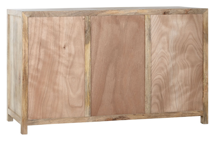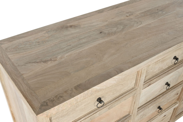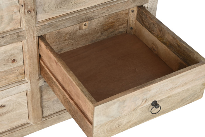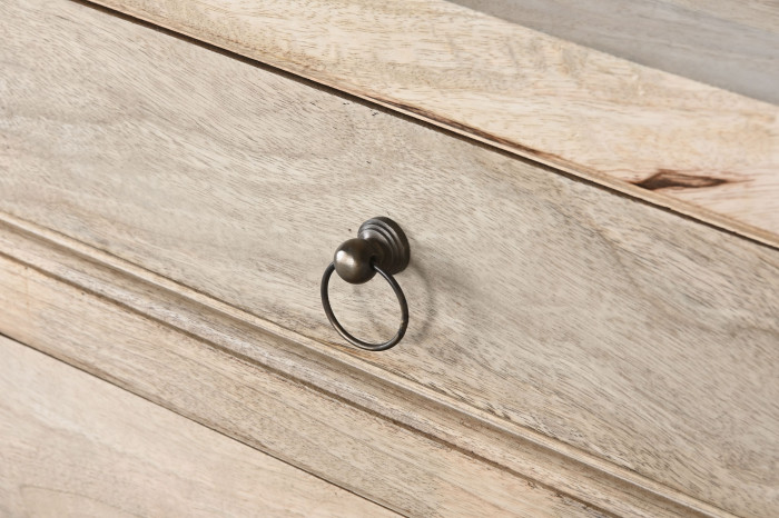 Każdy front to osobna opowieść o słojach, sękach i przejściach tonalnych, których nie da się zaplanować ani odtworzyć. Drewno mango pracuje światłem – raz jest jasne i miękkie, innym razem głębsze, bardziej nasycone. Dzięki temu komoda nigdy nie wygląda płasko. Każda szuflada różni się od kolejnej, a całość tworzy spójną, ale niepowtarzalną kompozycję.