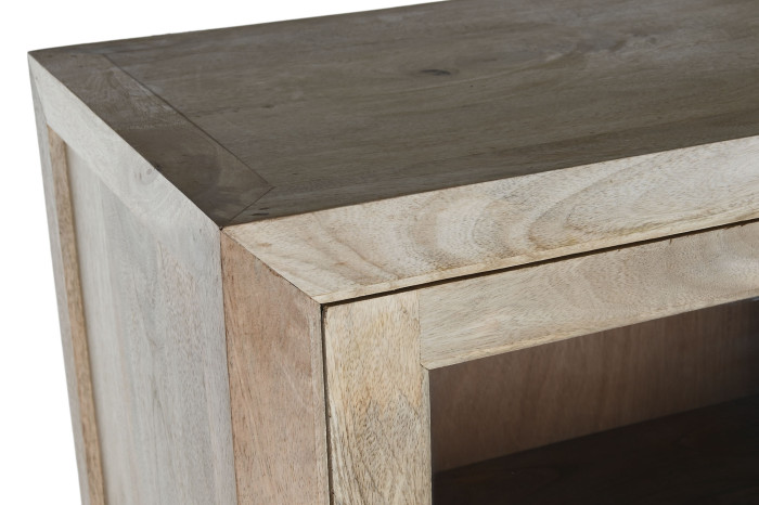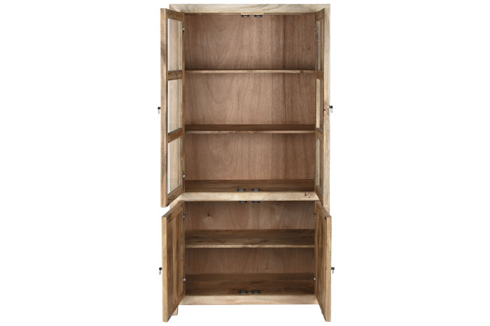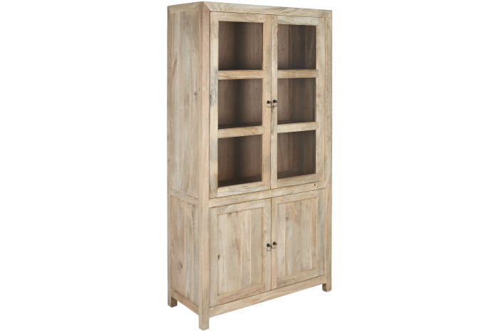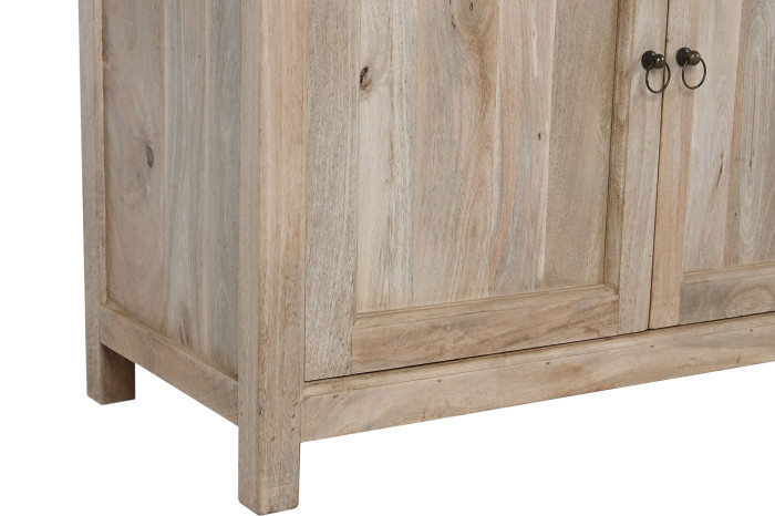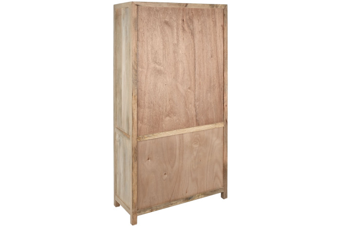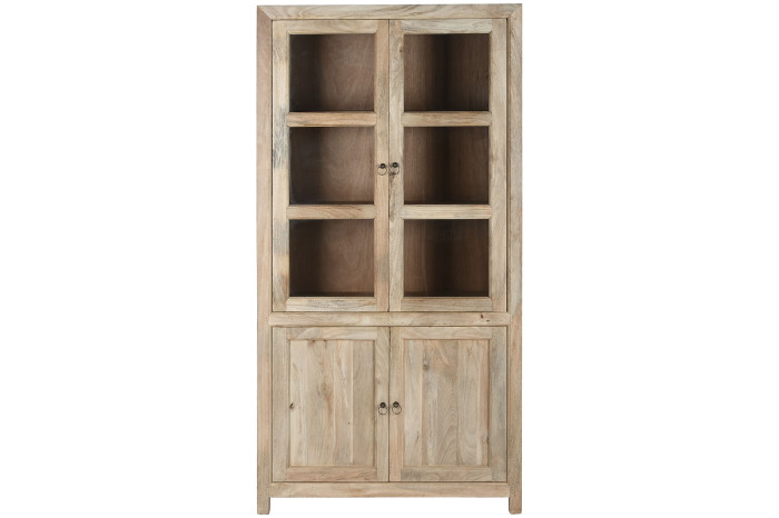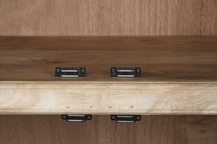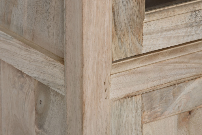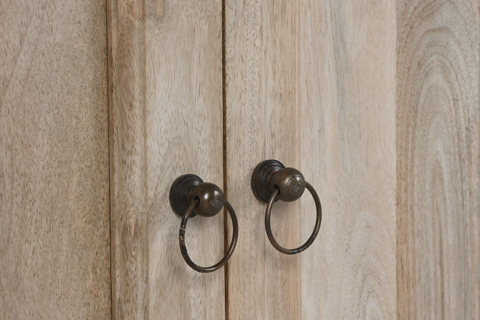 Drewno mango, z którego powstała, nie udaje niczego. Jego naturalne usłojenie, subtelna gra jasnych i ciepłych tonów, drobne nieregularności powierzchni – to wszystko dowody na to, że masz do czynienia z prawdziwym materiałem, nie z jego imitacją. Każda witryna jest inna, każda ma swój własny rysunek. Patynowane uchwyty w formie pierścieni domykają całość spokojnym, wyważonym detalem.