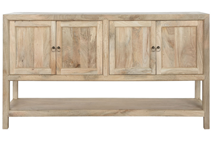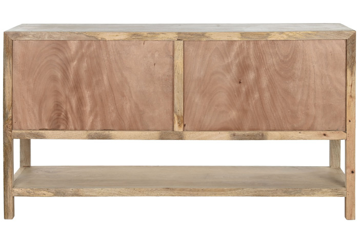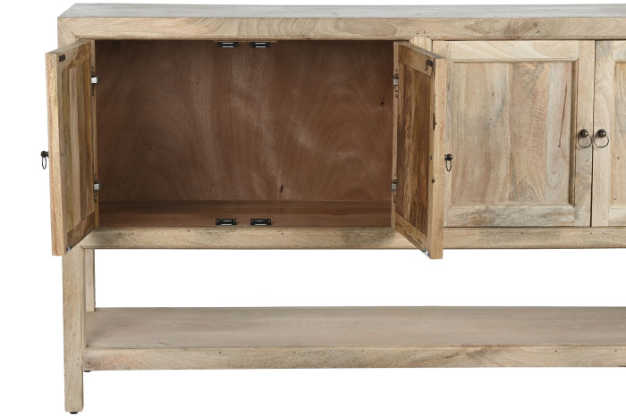 Cztery drzwiczki z dyskretnie pociągniętymi uchwytami z patynowanego metalu kryją przestronną przestrzeń do przechowywania. Dolna półka – otwarta, zapraszająca – to miejsce na ulubione książki, ceramikę ze wspomnieniami z podróży, koszyk z lnem albo po prostu odrobinę pięknej pustki. To właśnie ta równowaga między zamknięciem a ekspozycją sprawia, że wnętrze pozostaje uporządkowane, ale nigdy chłodne.