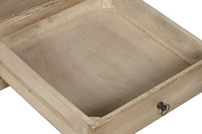 Szeroki blat z litego drewna mango staje się naturalnym punktem codziennych spotkań. To miejsce na kawę, książki, przedmioty, które pojawiają się i znikają w rytmie dnia. Powierzchnia nie narzuca scenariusza – pozwala aranżować ją swobodnie, zależnie od chwili.
