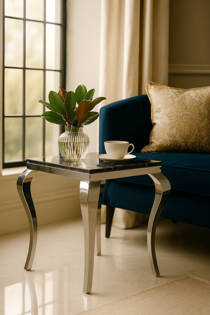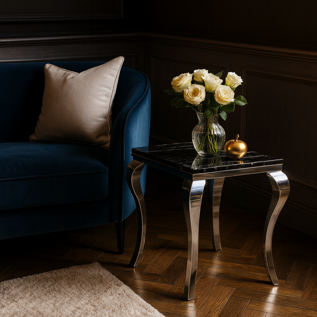 Stolik Bijou Steel to doskonałe połączenie nowoczesnego wzornictwa i klasycznej elegancji. Jego polerowana stalowa konstrukcja w połączeniu z czarnym marmurowym blatem tworzy efektowny mebel, który przyciąga wzrok. Wyprofilowane, smukłe nogi dodają mu lekkości, a jednocześnie stabilności, czyniąc go idealnym elementem do każdej przestrzeni. Każdy szczegół tego stolika emanuje wyszukanym stylem, który z pewnością ożywi każde wnętrze.