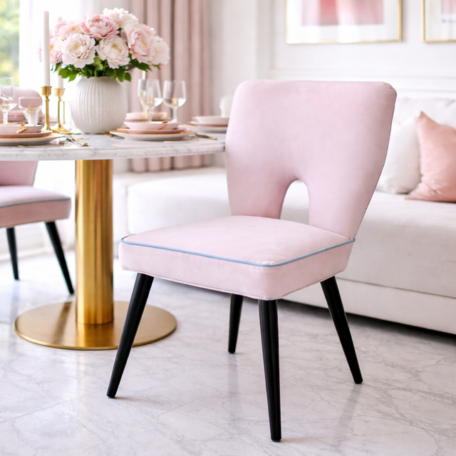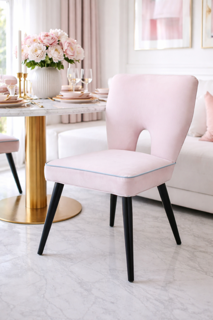 Krzesło Candy Shop w delikatnym, różowym odcieniu to idealny wybór dla osób poszukujących mebla, który wniesie do wnętrza subtelną elegancję. Tapicerowane aksamitną tkaniną, krzesło łączy w sobie estetykę i funkcjonalność, doskonale pasując do różnych aranżacji. Jego wygodne siedzisko wypełnione pianką poliuretanową zapewnia komfort użytkowania, a drewniane nogi z brzozy dodają ciepła i naturalnego charakteru. Różowe krzesło doskonale odnajdzie się w jadalni, salonie czy sypialni, wprowadzając do wnętrza wyjątkowy akcent kolorystyczny.