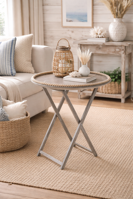 Stolik Rope Collection o średnicy 55 cm to wyjątkowy element wyposażenia, który doda Twojemu wnętrzu unikalnego charakteru. Z okrągłym blatem z naturalnego drewna, obramowanym stylowym sznurkiem, mebel ten przyciąga wzrok i stanowi doskonałe połączenie estetyki z funkcjonalnością. Jego lekka, a zarazem solidna konstrukcja sprawia, że jest łatwy do przenoszenia, co czyni go idealnym towarzyszem w różnych aranżacjach.