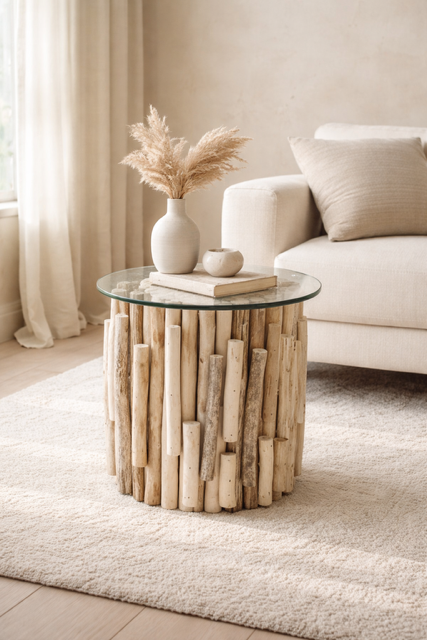 Każdy egzemplarz stolika Timber jest wyjątkowy. Połączenie surowego drewna z gładkim szkłem tworzy interesujący kontrast, który przyciąga wzrok i wzbogaca przestrzeń. Stolik jest także funkcjonalny – idealny jako miejsce na napój, książkę czy dekorację, co sprawia, że staje się centralnym punktem w każdym pomieszczeniu.